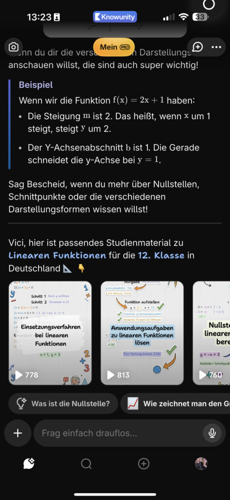 Also haben Emma und ich es uns zusammen angeschaut. In der App gibt es eine KI-Funktion, bei der man ein Foto von der Aufgabe machen kann, und dann wird Schritt für Schritt erklärt, wie man zur Lösung kommt. Nicht nur das Ergebnis, sondern wirklich der Weg dahin. Und das fand Emma besonders hilfreich: Wenn sie bei einem Schritt hängt, kann sie direkt nachfragen, „Warum ist das jetzt so?“ oder „Kannst du das anders erklären?“, und bekommt genau dazu eine Erklärung.